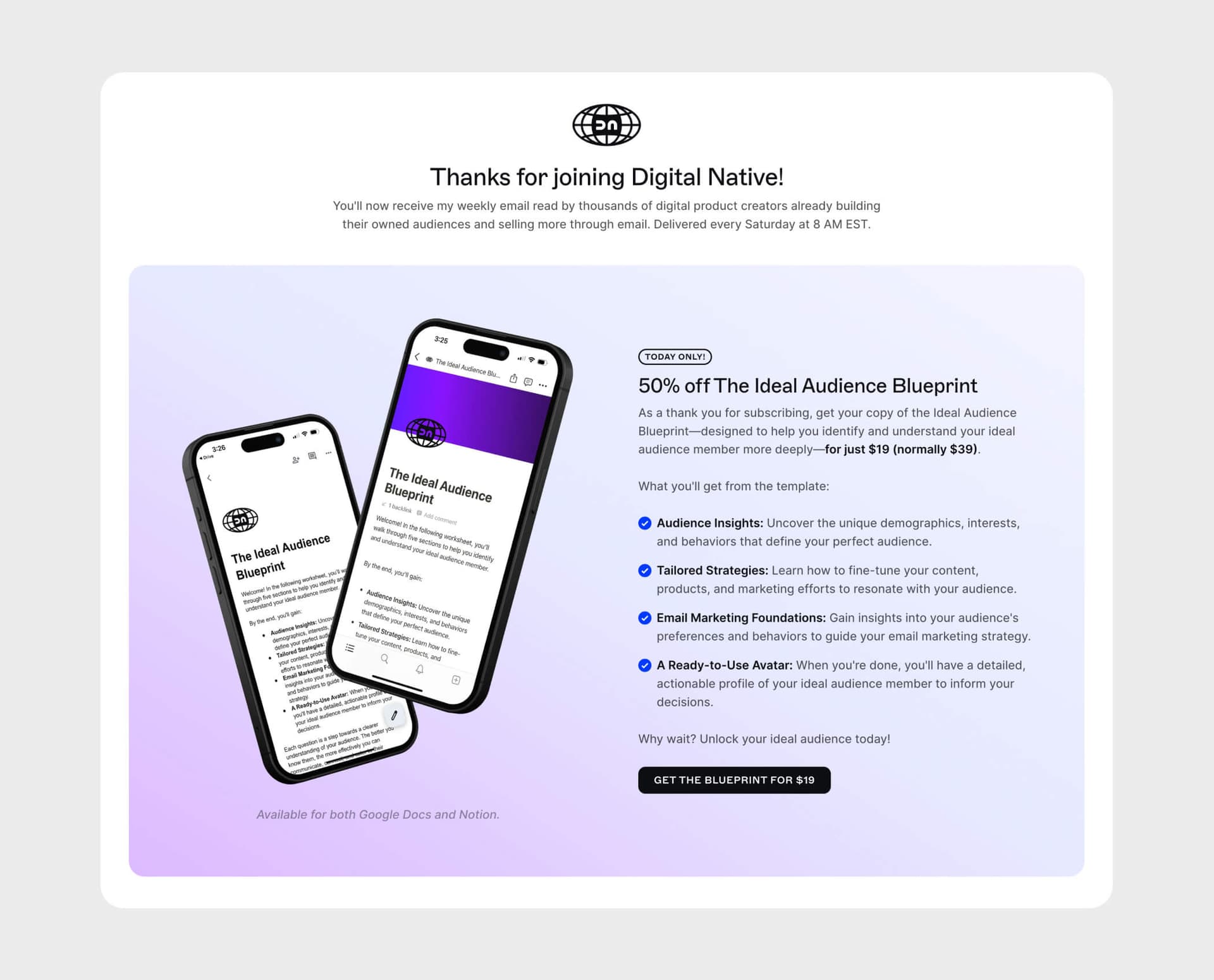 To show you that I eat my own dog food, I offer new subscribers a 50% discount on The Ideal Customer Blueprint on my Thank You page.